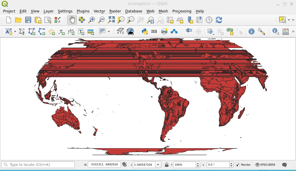 After working with raster tiles and initial experiments with vector tiles, I've started a new OL example, reprojecting a thematic map with a GeoJSON vector data source. GeoJSON uses geographic (WGS84) coordinates, which is a good starting point for Equal Earth or other projections. The first steps went well, but soon after changing the center meridian, the first ugly rendering glitches appeared.
